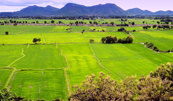 Рисовые поля в предгорье Таиланда.Дорога, как стрела проходит через поля в центральной части страны с юга на север.