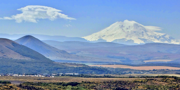 Вид на Эльбрус с горы Машук в Пятигорске на расстоянии 120 км.