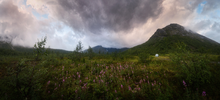Одинокая палатка в долине северных гор