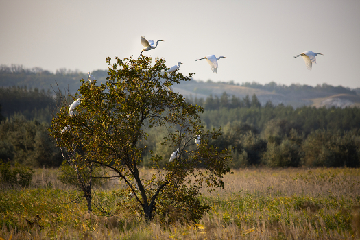 Белая цапля спасаясь от охотников садится на деревья