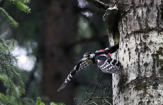 Конец мая. У дятлов подросли птенцы, и хор их голосов слышен на десятки метров вокруг. Родители только и успевают, что приносят детям еду и (см фото) выносят из дупла мусор.