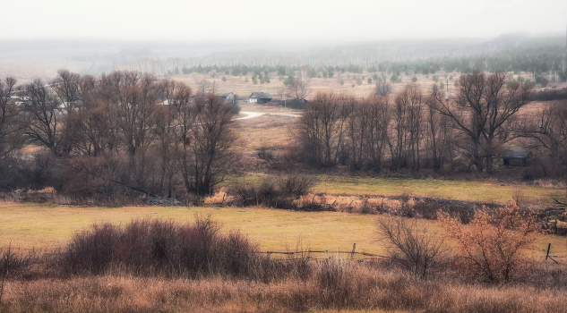 осень, деревня, туман