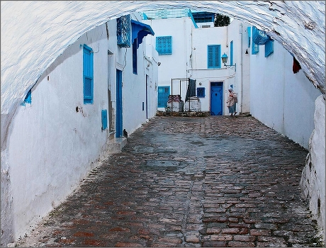 "Бело - голубой" город в Тунисе . Характерен белыми стенами и синими дверями домов, узкими , извилистыми улочками, из которой вышла женщина в платке.