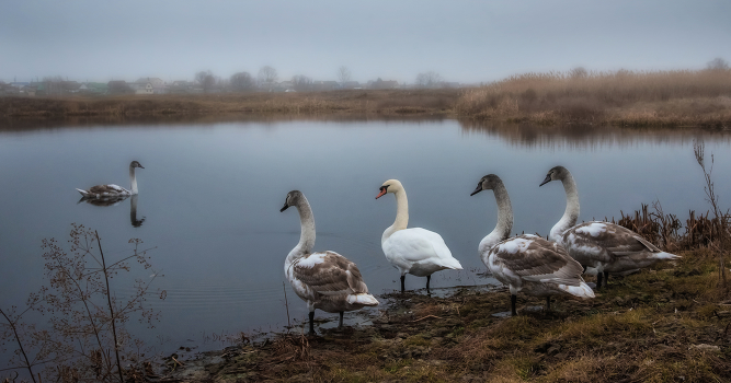 осень, лебеди, речка