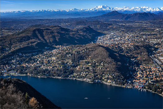 Вид на озеро от маяка им. Александра Вольта. Отсюда видны заснеженные вершины Альп. Высота примерно 1200 м.
