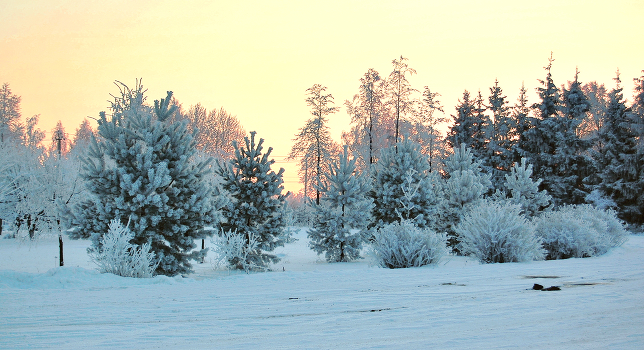 Праздничный вечер, сосны в инее