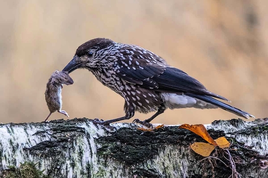 Кедровка или ореховка. Вид птиц из семейства врановых (Corvidae). Международное научное классификационное имя — Nucifraga caryocatactes. Оно по смыслу означает «разрушитель орехов». Небольшая птица, чуть меньше галки и с более тонким и длинным клювом. Длина кедровки 30 сантиметров, хвоста 11 сантиметров. Вес 125—190 граммов. Но, как видно по снимку, кедровки любят не только орехи. Обитая в условиях естественной среды, эти пернатые живут не меньше 10 лет.