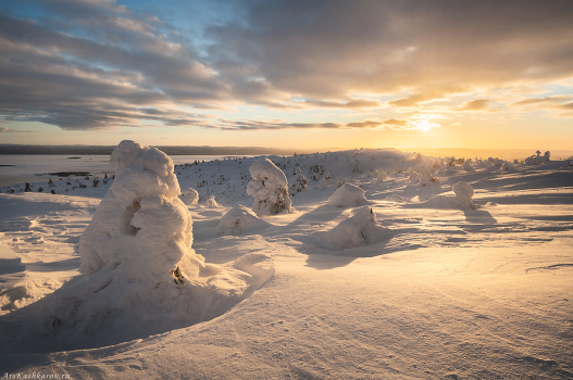 Зима в заполярье. Кандалакша, Кольский полуостров. На вершине сопок лес сменяется тундровыми пейзажами с отдельно стоящими низкорослыми ёлочками