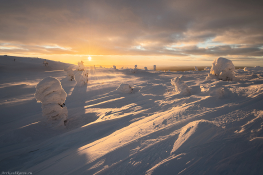 Постоянные ветра и метели создают на вершинах заполярных гор довольно суровые условия для жизни растений, здесь господствуют настоящие арктические ландшафты