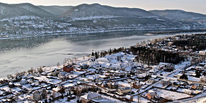Внизу — п. Удачный. На берегу — архитектурный ансамбль Свято-Успенского мужского монастыря.