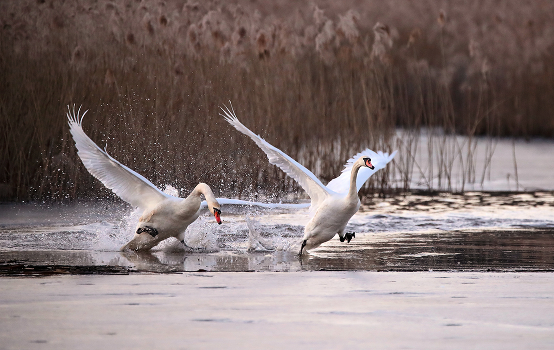 весна, март. матерый лебедь гоняет молодого.