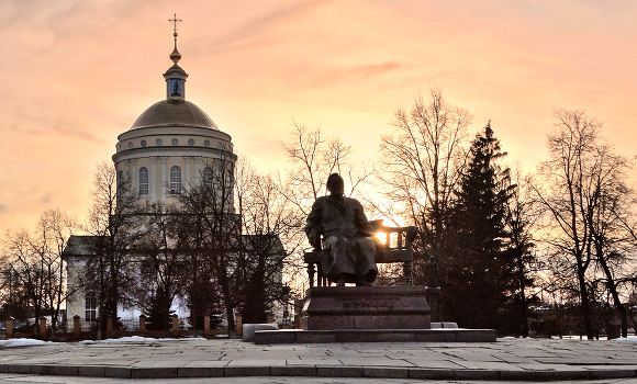 С Благовещеньем! Памятник Лескову рядом с храмом Михаила Архангела в Орле