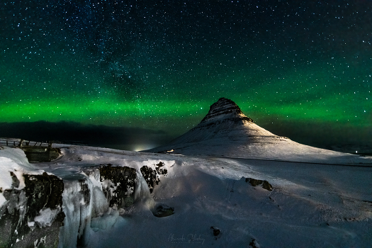 Kirkjufell (Церковная Гора), замерзший водопад, Северное сияние и Млечный путь - все в одном флаконе. Исландия, февраль 2022 г.
