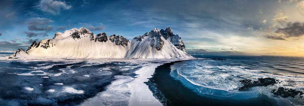 Полуостров Стоккснес и гора Вестрахорн, Исландия. Панорама с воздуха