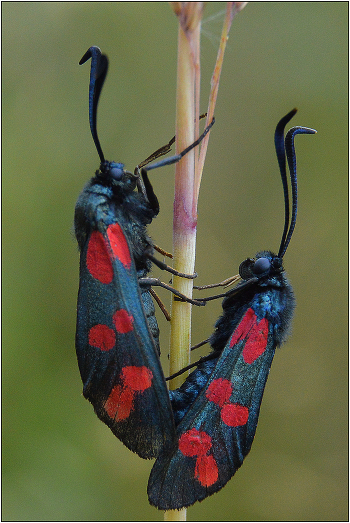 Бабочки семейства ПЕСТРЯНКИ. Пестрянка таволговая - Zygaena filipendulae. Летает в июле-августе.