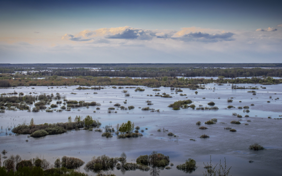 Пейзаж с водой, деревьями и облаками