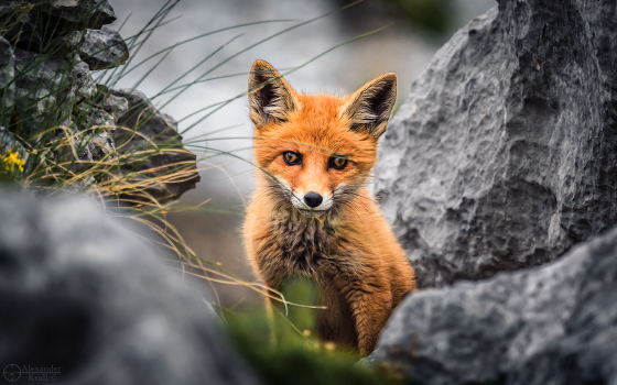 Один из двух лисят, встретившихся мне между скал у восточных склонов г. Оштен на территории Кавказского государственного природного биосферного заповедника. Спрятавшись за несколькими травинками он долго наблюдал за тем, как я снимаю серн.
