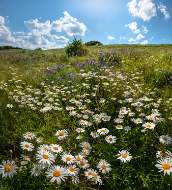 Жаркий июньский день, наполненный вкусным запахом разнотравья. Цветёт Нивя́ник обыкновенный, или поповник.