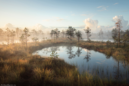 Летнее утро на верховом болоте – тишина и умиротворение. Болотные травы, обильно покрытые росой, блестят в первых лучах утреннего солнца. Приглашаю в фототуры на болота: летом, осенью, зимой!