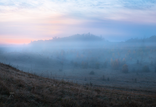 Краски зари. Густой туман живописно расстилается слоями в степном овраге. Алексеевский район. Сентябрь, 2022 года. Из фотопроекта "Земля Белгородская».
