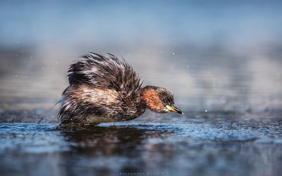 Малая поганка стряхивает влагу, накопившуюся в перьях при нырянии.