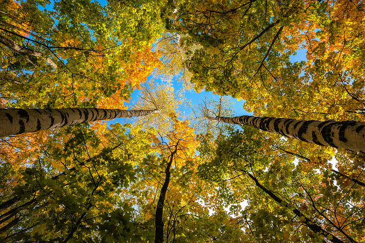Узоры кленовых и берёзовые крон. Навстречу солнцу и синему небу. Вейделевский район. Сентябрь, 2022 года. Из фотопроекта "Земля Белгородская».
