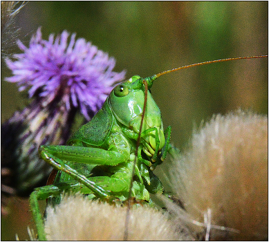 Кузнечик зеленый - Tettigonta viridissima. Длинные усы позволяют кузнечикам исследовать окружающий мир. В данном случае усик исследует переднюю линзу объектива на предмет опасности.