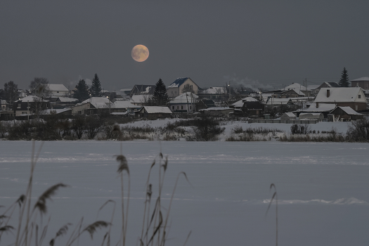 вечер, деревня, луна, дым.