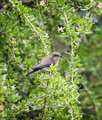 Палестинская нектарница - самочка. Длина тела с клювом и хвостом 10 см, вес 8 гр. Взрослые птицы питаются нектаром. В воздухе они зависают как колибри, но ненадолго, пьют нектар, сидя на веточке.
