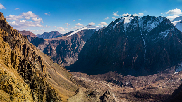 Северо-Чуйский хребет, долина реки Большой Актру. Снято со склона пика Кызыл-Таш, напротив пик Купол, с обоих сторон которого спускаются языки ледника Малый Актру. Внизу кадра Бараньи лбы.