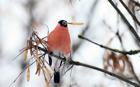 снегирь лакомится семенами клена, архивное фото