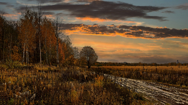 Осень небо дорога поле деревья