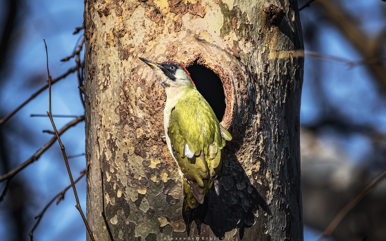 До весны еще далеко, но самка зеленого дятла не забывает навещать дупло в стволе платана, оглядываясь при этом по сторонам.