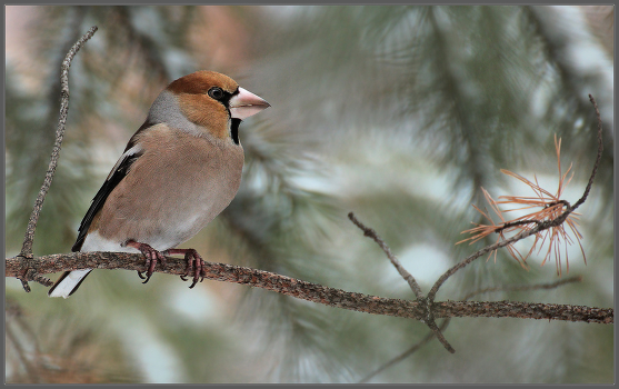 Дубонос. Пока решал, стоит ли лезть в кормушку, её заняла белка. Челябинский бор
