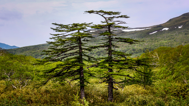 Типичные для Итурупа деформированные Курильские лиственницы. У одних деревьев макушка выглядит спиленной, у других загибается вбок. Деревья начинают расти вширь.
