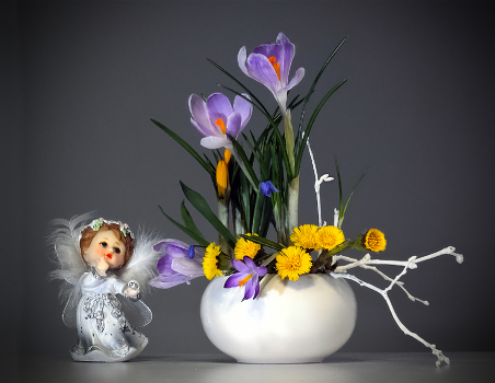 Натюрморт с первоцветами и ангелочком