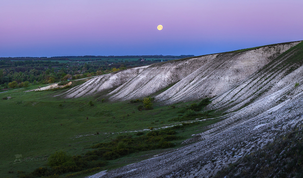 Меловые холмы при весенней луне на рассвете. Корочанский район. Май, 2022 года. Из фотопроекта "Земля Белгородская».