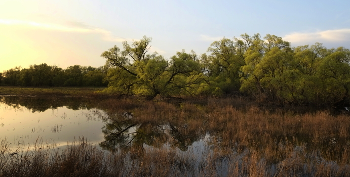 На закате.