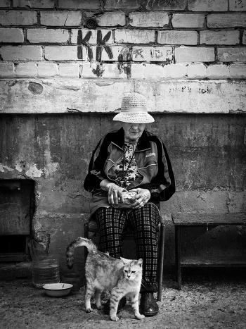 Бабушка во дворе кормит кошек. В городах где экономят на всём, стали заделывать окна в подвалах,закрывать двери в подвалы,кошки перевелись. И теперь что б пофоткать бродячих котиков, порой стОит походить и побродить по городу...