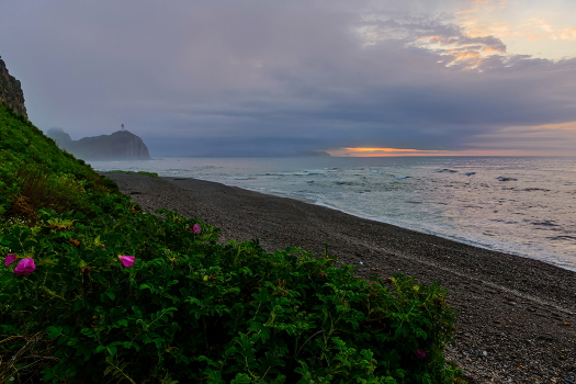 Вид на мыс Бринера со стороны Двух Братьев, июль 2023. На ПП морской шиповник.