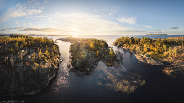На своих фотографиях я довольно часто включаю в композицию солнце. Снимая панорамы с дрона, я, по привычке, тоже часто беру источник света в кадр. Однако, ввиду невысокого качества камеры квадрокоптера, чтобы получить такой вот результат приходится изрядно повозиться при обработке
