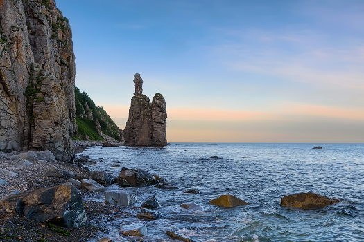 Еще одна из природных достопримечательностей нашего, северо-восточного побережья Приморья - кекур Белая Церковь. Раньше доступ был открыт, теперь это территория заказника "Черные скалы", и попасть можно только пешком через кордон, с обязательной записью в журнал. Так что для съемок в режимное время - проблематично. Мы ходили к вечеру, просто в режиме прогулки с внуком, времени, чтоб побродить, особо не было - ждала обратная двухчасовая "пешка", чтобы до темноты выйти к кордону... Может быть, еще попробуем выбрать время...