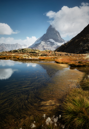 На берегу горного озера Риффель. Вершина Маттерхорн в прямой видимости.