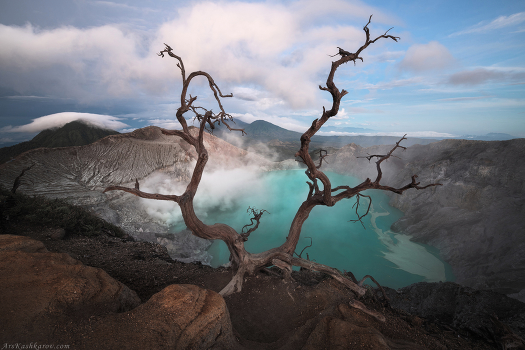 Засохшее дерево на краю кратера - самая желанная для туристов локация вулкана Иджен. Ещё 10-15 лет назад выбросы токсичных газов из фумарол, по всей видимости, были значительно ниже, и здесь росли деревья. Сейчас активность вулкана возросла, и деревья на кромке кратера засохли. Индонезия, остров Ява