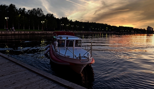 вода катер берег фонари закат
