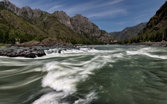 Рядом со штольнями находятся Еландинские пороги. Катунь здесь разделяется скальным островом на два рукава — большой левый и узкий правый.