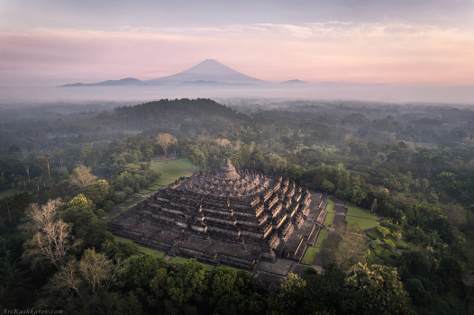 Классический пейзаж острова Ява на восходе. Вулканы и древние храмы, затерянные в джунглях. Боробудур, Индонезия