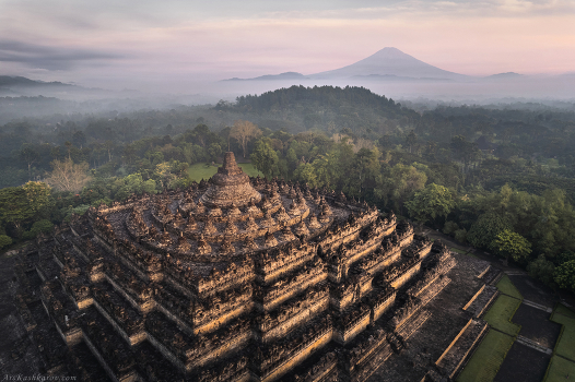 Боробудур - один из древнейших хорошо сохранившихся буддийских храмов в мире, находится в центральной части острова Ява в Индонезии. По оценкам историков Боробудур был построен в VIII - IX веках. Однако впоследствии люди покинули эти места, вероятно после сильнейшего извержения вулкана Мерапи в 1006 году. Храм оказался погребен под толстым слоем пепла, а позднее поглощен джунглями. Лишь в 1814 году монумент был обнаружен и расчищен, частично восстановлен лишь в начале XX века. В 1973-1984 под эгидой ЮНЕСКО была проведена капитальная реставрация: разборка сооружения, укрепление холма и полная реставрация храма