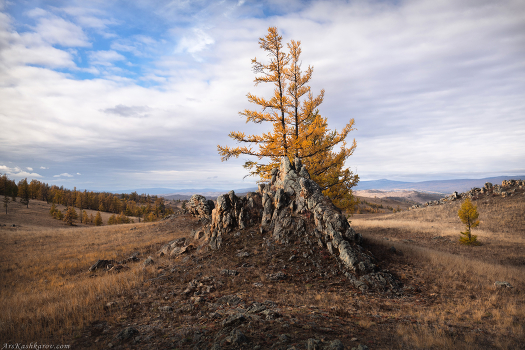 Ландшафт Тажеранских степей складывается из скалистых останцев, отдельно стоящих лиственниц и ковра степных трав