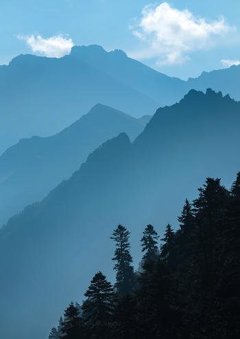 Горы, сотканные из утреннего воздуха. Воздушная перспектива горных долин. Из серии «Акварели воздуха и света». Из фотопроекта «Кавказ без границ».